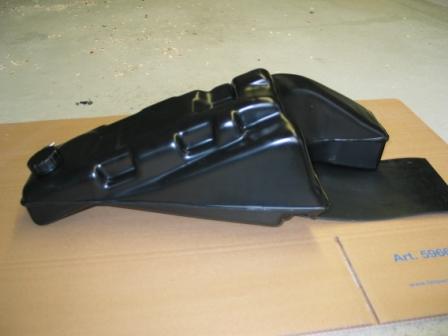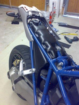The 7-liter tank is ready to install. It is made of polyethylene (6 mm thick), either black or white. You can chose between two options: a conti-dumper version or a conventional spring support (Oehlins, Wilbers, Whitepower) version, now also possible to use here the Conti air dumper. The tank can be fixed at your choice either with my aluminium strut or with the original BMW passenger footpegs.