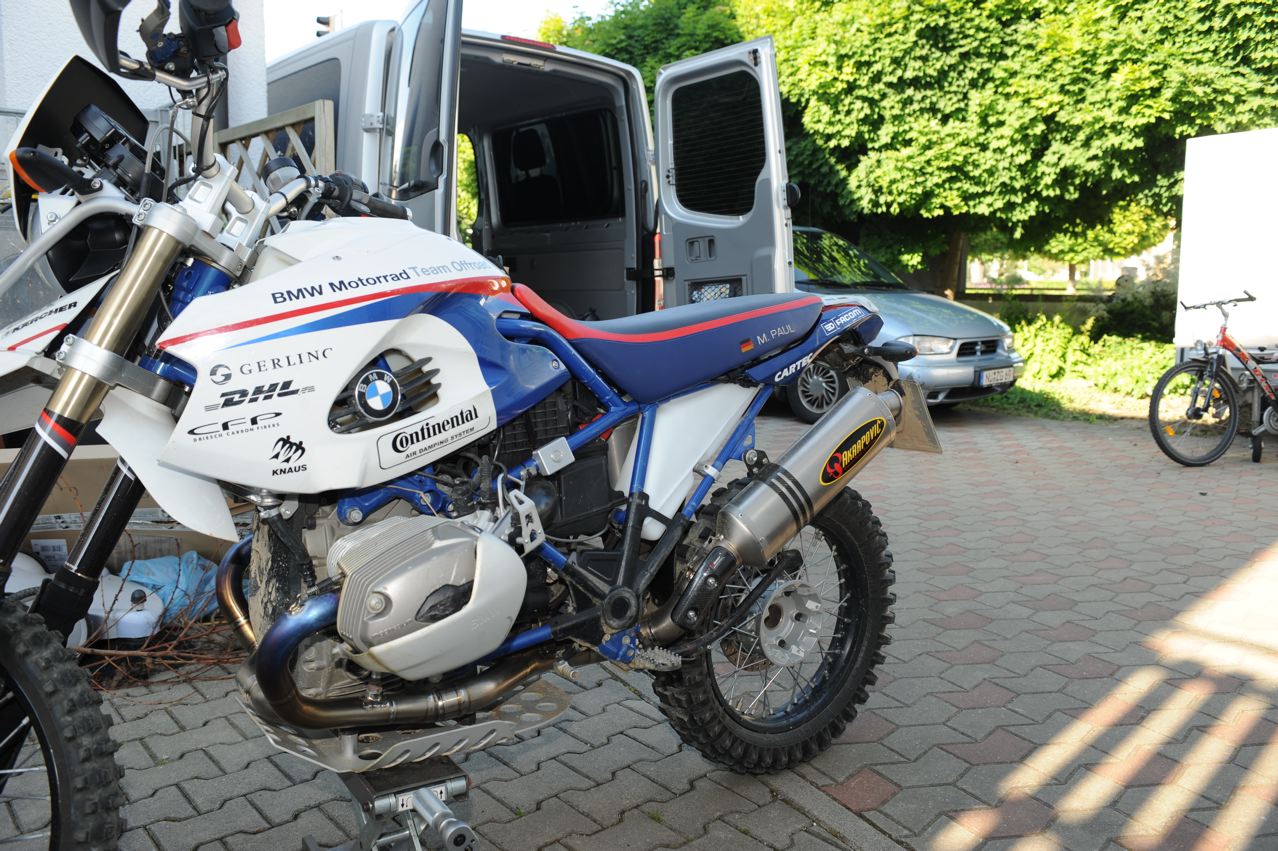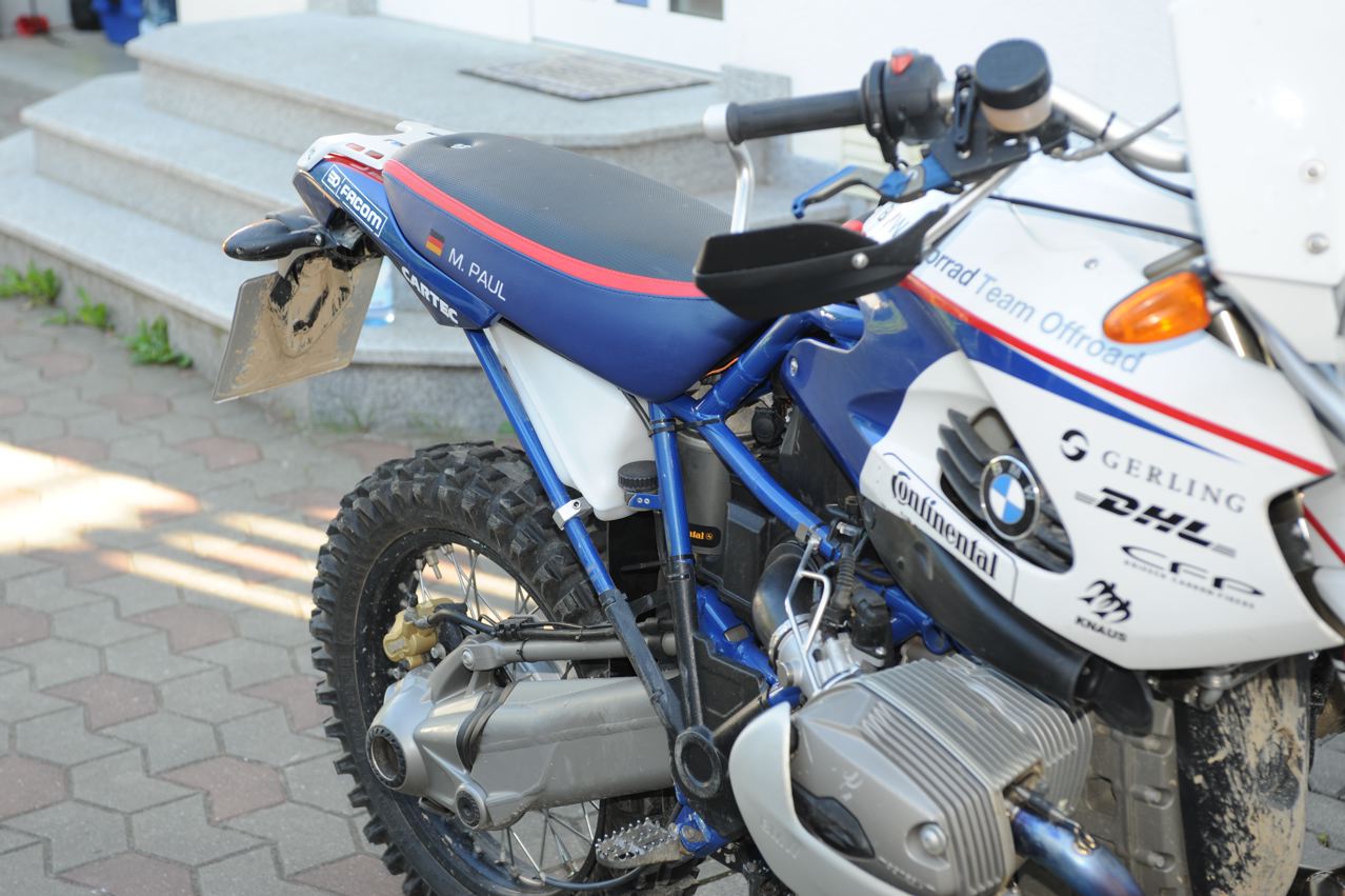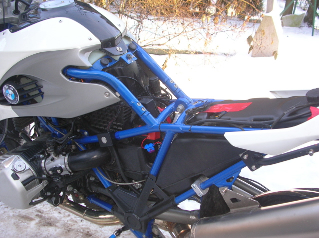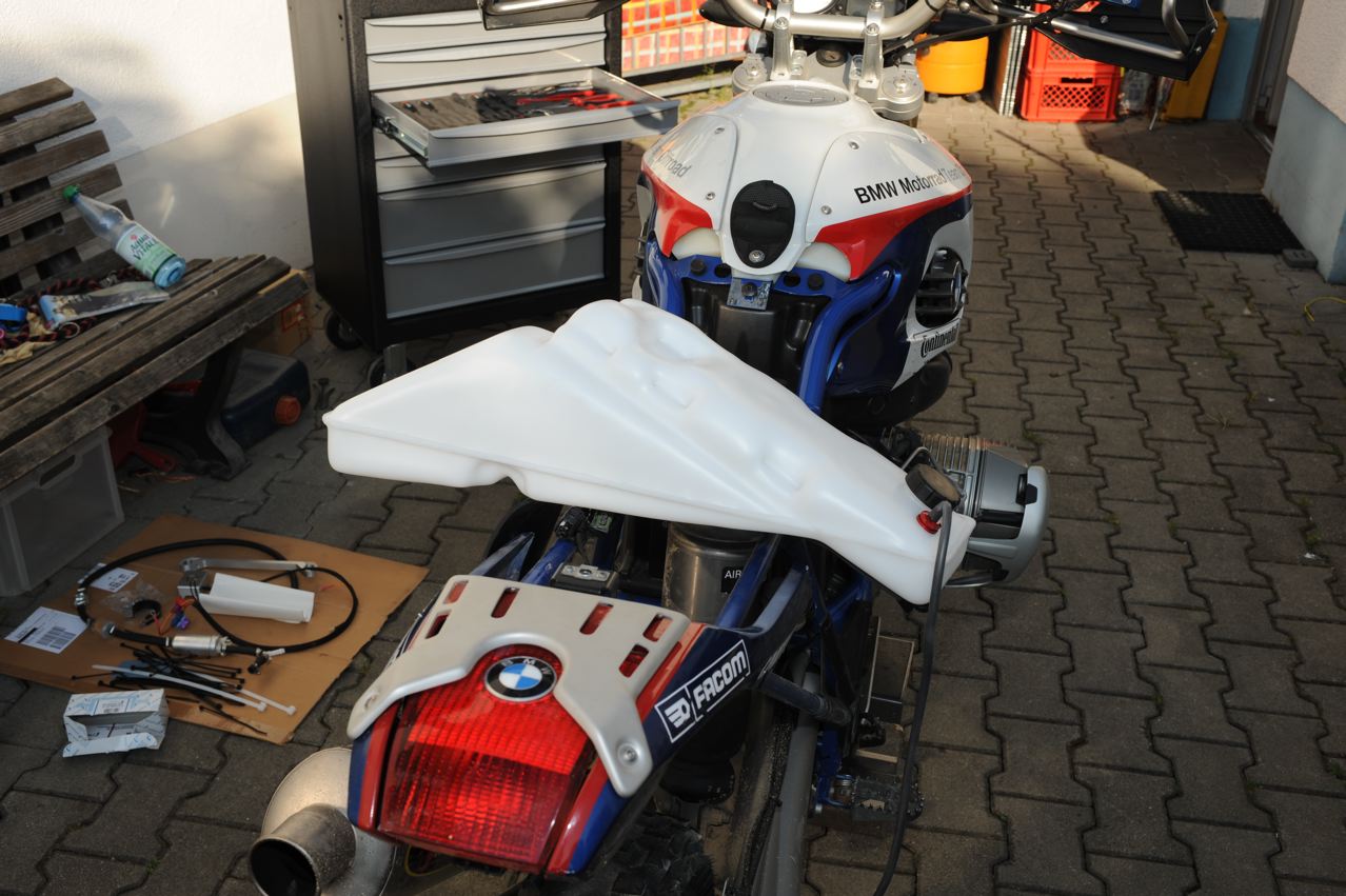 Der Tank ist einbaufertig und fasst ca. 7 Liter. Das Material ist Polyethylen (6mm stark) wahlweise in schwarz oder weiss. Es gibt zwei Varianten: Conti Luftfederbein oder konventionelles Federbein (Oehlins, Wilber, WhitePower). Bei dieser Variante kann man jezt auch das Conti Federbein verwenden. Die Befestigung erfolgt wahlweise mit meiner Alustrebe oder den Orginal BMW Sozia-Fussrasten.